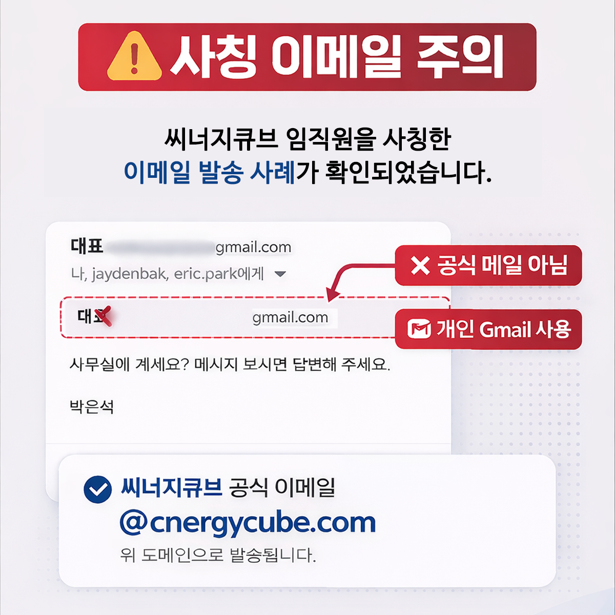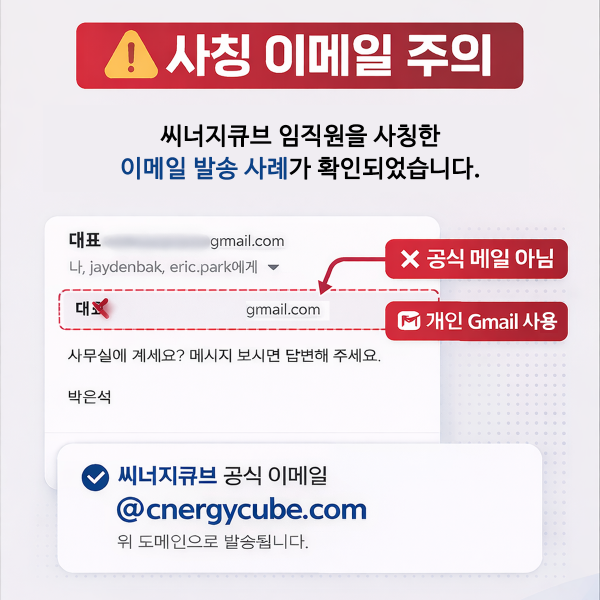 해당 메일은 씨너지큐브와 전혀 관련이 없으며, 당사의 공식 이메일 도메인(@cnergycube.com)이 아닌 개인 Gmail 계정에서 발송된 것으로 확인되었습니다.